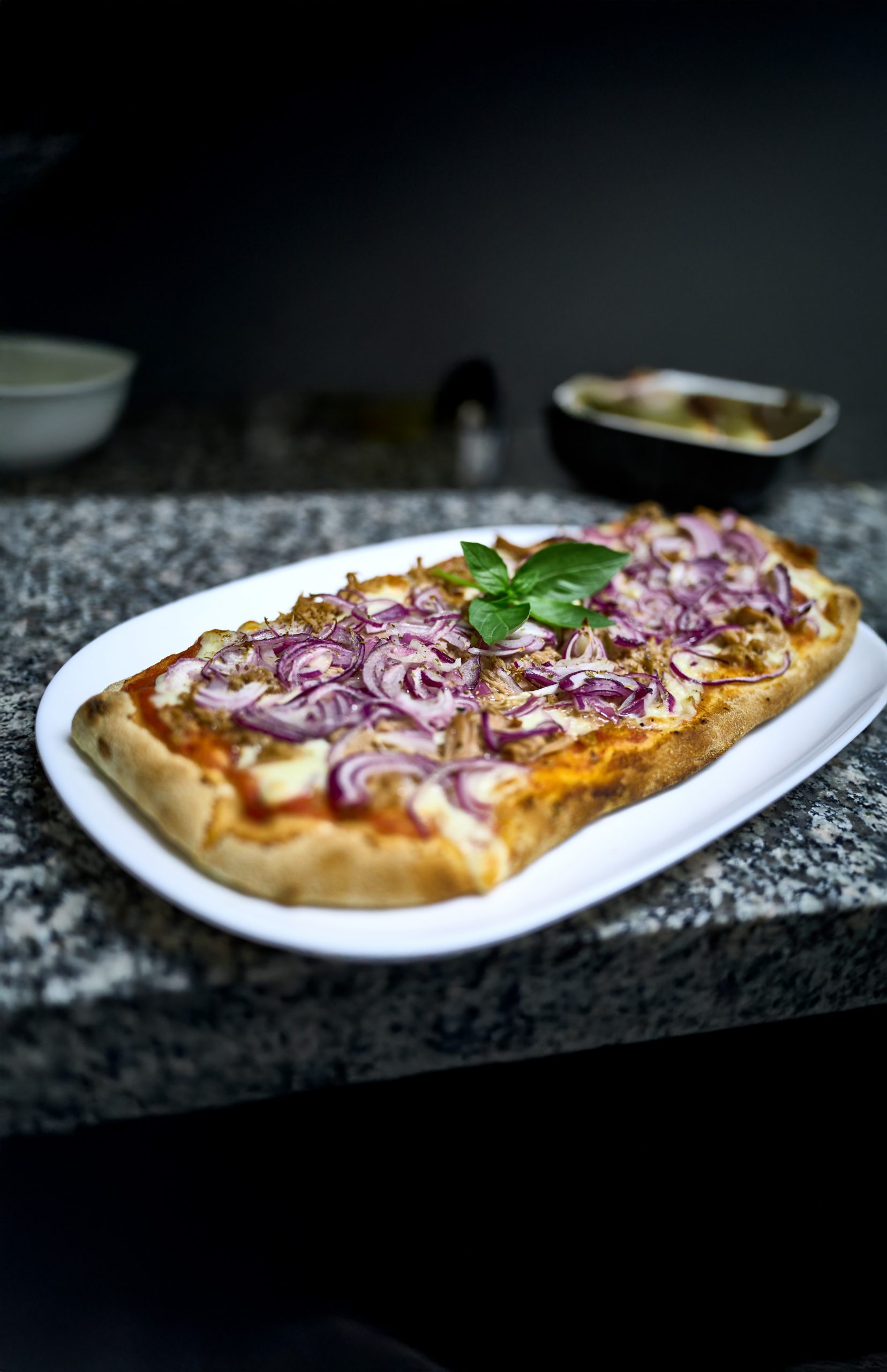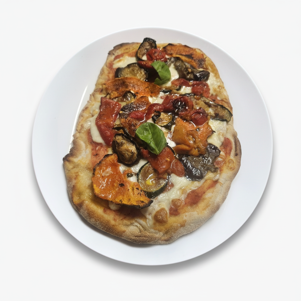 Mit Gemüse der Saison, Tomatensauce und Mozzarella